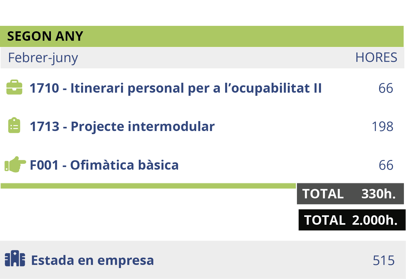 Aquest cicle formatiu té una durada total de 2.000 hores, i està dividit en: