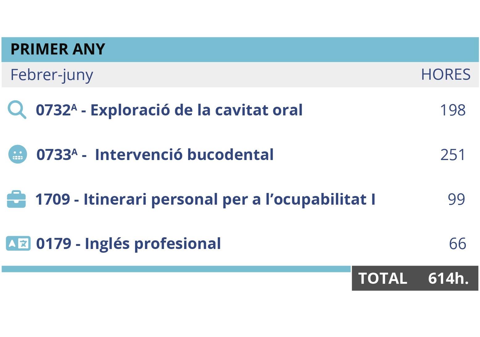 Aquest cicle superior en Higiene Bucodental Online també inclou pràctiques obligatòries que els estudiants imparteixen sota hores d’estada a l’empresa.