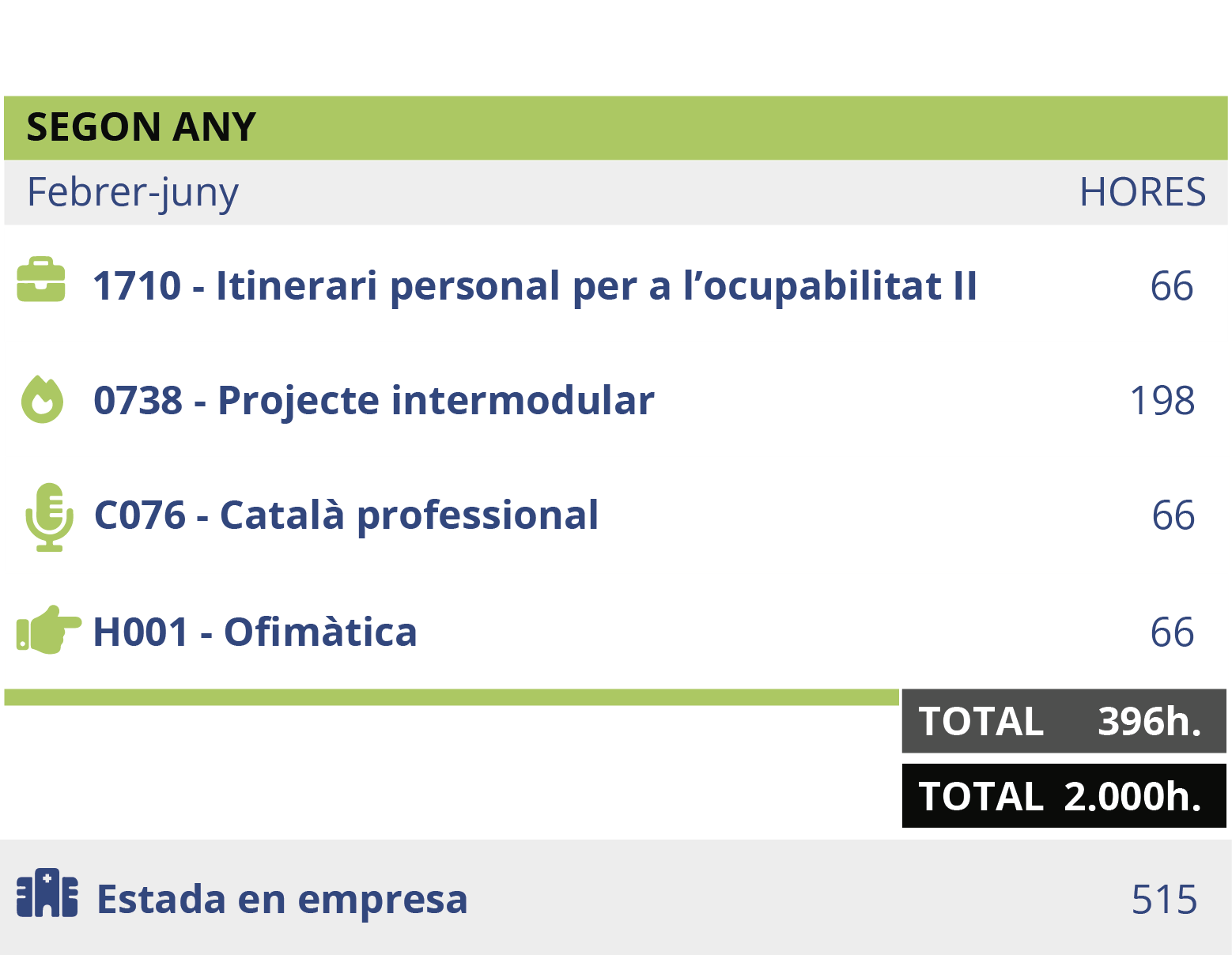 Aquest cicle formatiu té una durada total de 2.000 hores, i està dividit en: