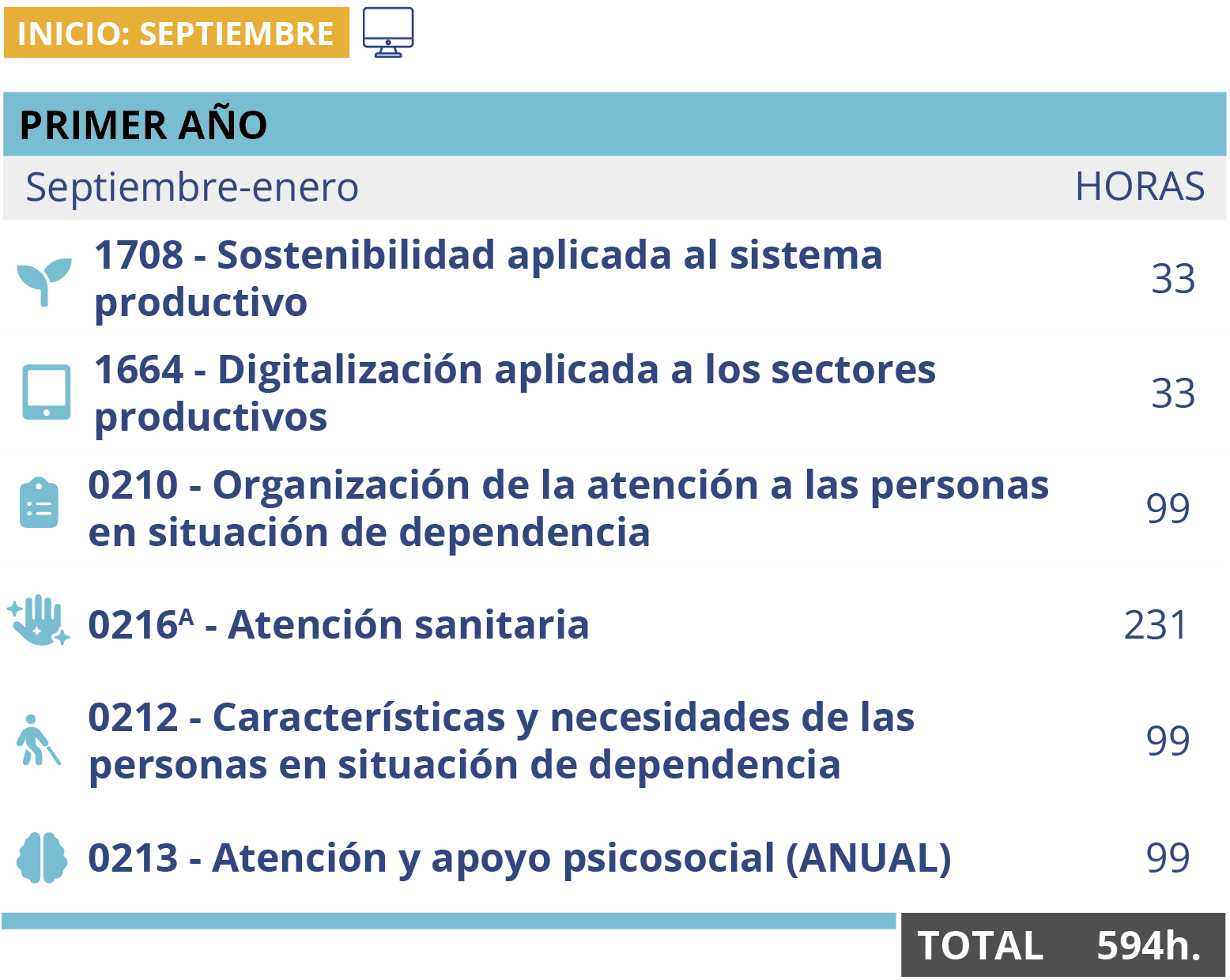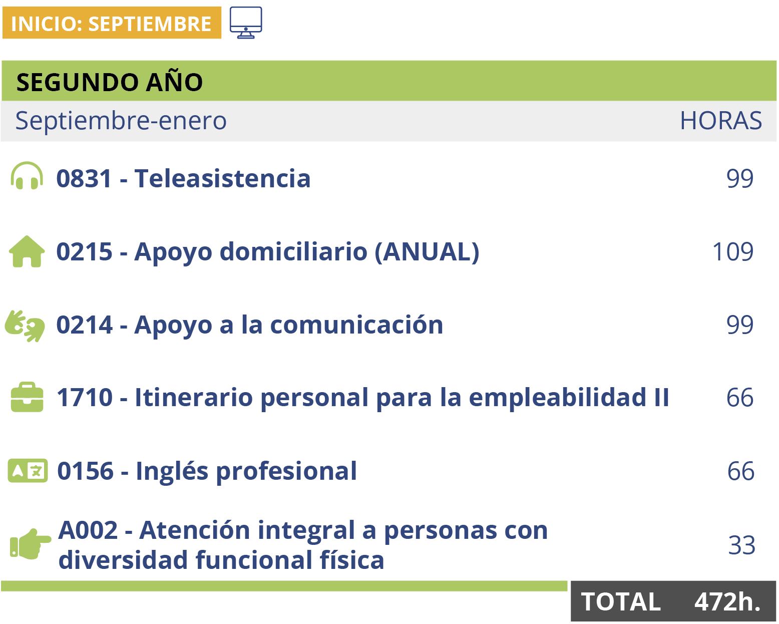 Este ciclo medio en Atención a Personas en Situación de Dependencia Online también incluye prácticas obligatorias que los estudiantes imparten bajo horas de estancia a la empresa.