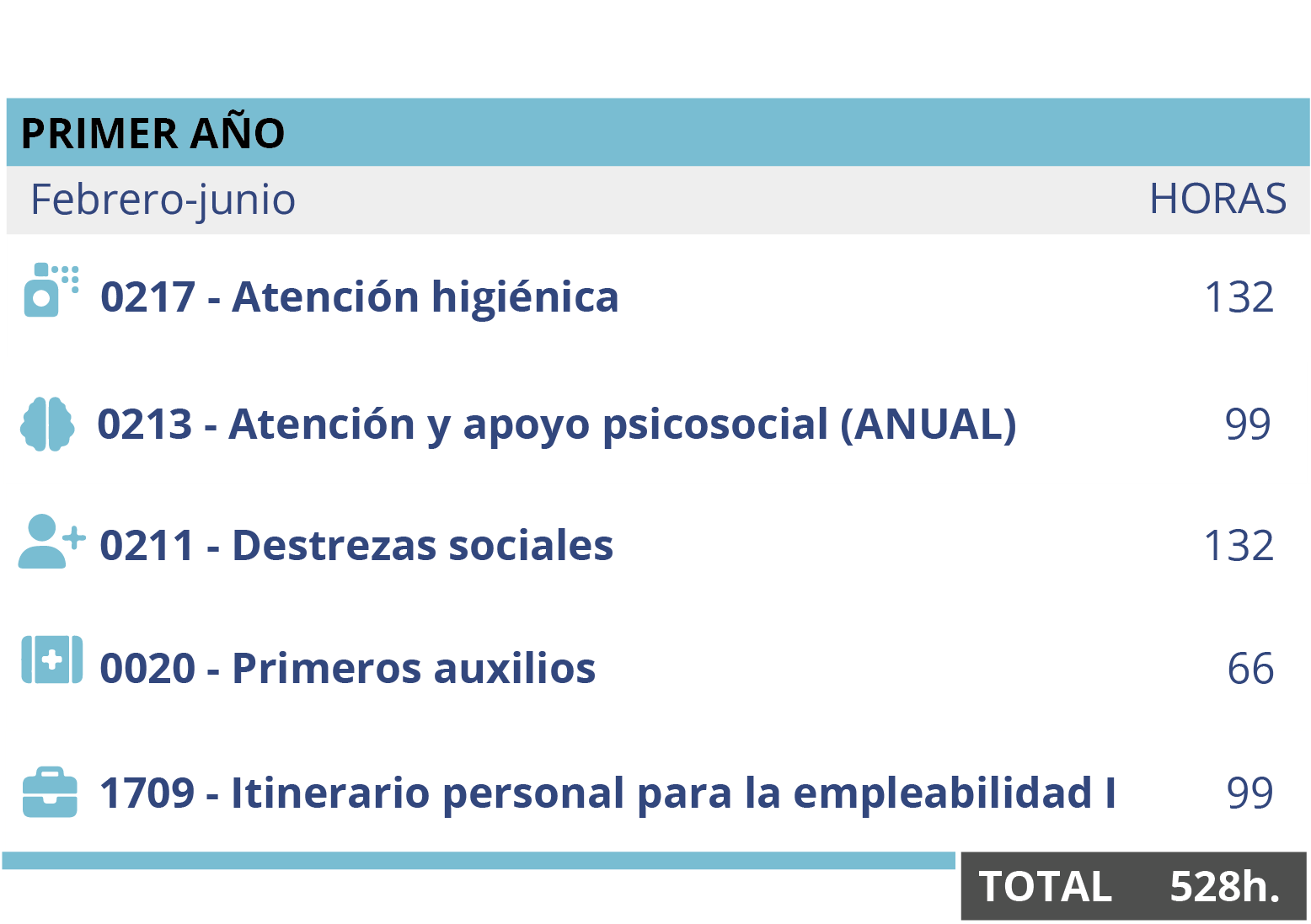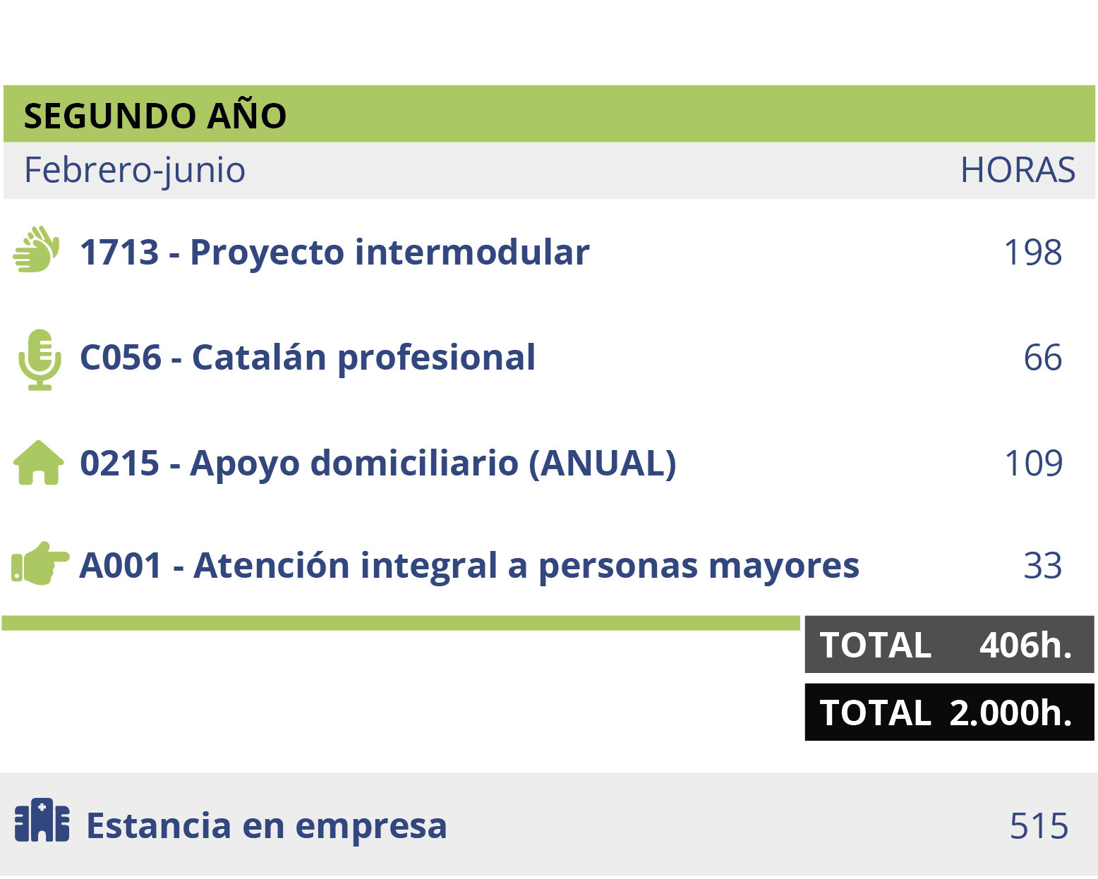 Este ciclo formativo tiene una duración total de 2.000 horas, y está dividido en: